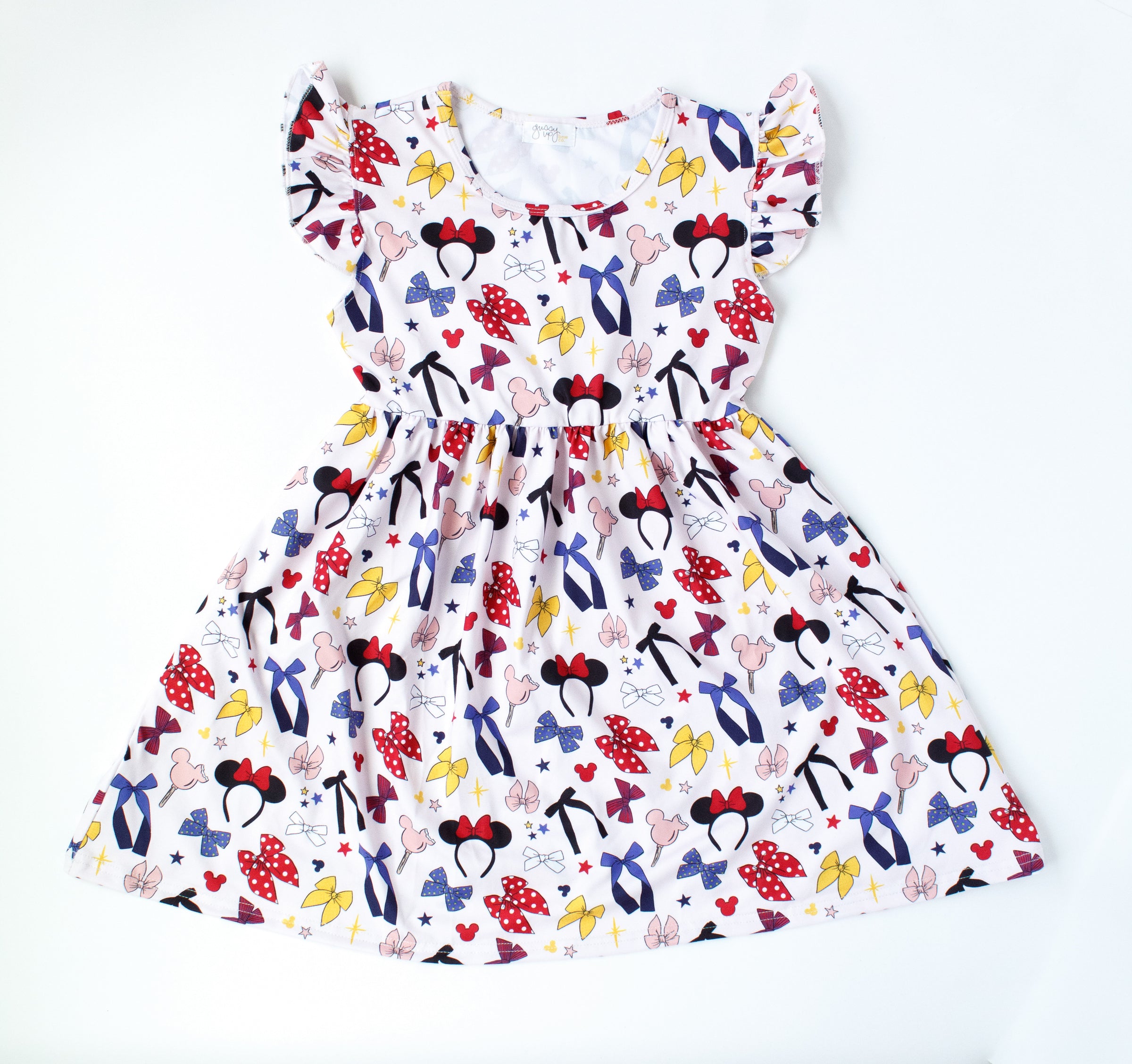 The Magical Bow Dress from Gussy Up Bow Co. is the perfect fit for your little princess! Whether she's at the playground or the happiest place on earth, she'll be cute, comfy, and covered in characters in our picture-perfect knee length dress. Crafted from buttery soft, wrinkle resistant fabric, this fun spin-dress is perfect for travel. It features a few of every girl's favorite things: sweet flutter sleeves, and a simple crew neckline. Classic shapes, magical characters, and iconic ears adorn her as she makes memories that last a lifetime.